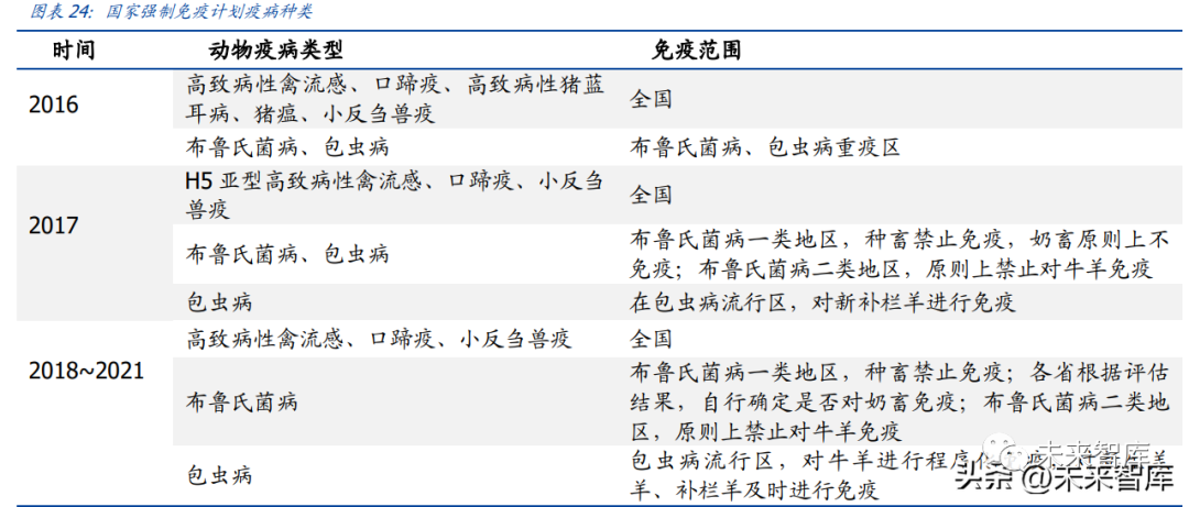 强免苗由政采逐渐转向市场,目标 2025 年全面取消政采渠道。2017 年原农业部、财 政部发布《关于调整完善动物疫病防控支持政策的通知》,提出进一步强化畜禽养殖经 营者的强制免疫主体责任,对符合条件的养殖场户的强制免疫实行“先打后补”,逐步 实现养殖场户自主采购、财政直补。2020 年 11 月,农业农村部发布《关于深入推进动 物疫病强制免疫补助政策实施机制改革的通知》,继续深入推进“先打后补”政策,目 标定于:1)2020-2021 年在 10 个省份的规模养殖场户开展深入推进“先打后补”改革 试点,其他省份根据本地实际自行确定试点范围和对象;2)2022 年全国所有省份的规 模养殖场户实现“先打后补”,年底前政府招标采购强免疫苗停止供应规模养殖场户;3) 2025 年逐步全面取消政府招标采购强免疫苗。具备研发+生产+渠道多重优势的行业龙头有望受益于强免苗市场化发展趋势。政采转 市场有利于供需市场化匹配与兽药资源充分利用、鼓励兽药企业产品创新升级、以及强 化养殖端主体责任与防疫意识等。由于市场渠道竞争更加充分,产品力成为竞争的最核 心因素,同时市场化销售能力出色的企业已形成直销、经销多渠道布局,具备研发+生 产+渠道多重优势企业有望受益于强免苗市场化发展趋势。