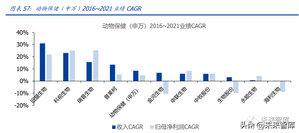 55.28%/45.11%/23.83%/31.98%,从不同规模企业数量角度,大型企业、中型企业数 量占比分别为 5.51%、54.21%,动物保健(申万)板块 2017-2021 年营收 CAGR 为8.5%,高于动保行业销售规模同期 CAGR 7.8%,行业龙头马太效应显著。