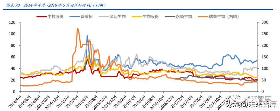 从估值水平看,与 2014~2018 年生猪周期相似,在高成长阶段动保板块仍享受一定估 值溢价,且估值水平维持与下游猪价景气保持相对高位阶段一致程度更高,动保板块后 周期属性有所强化。