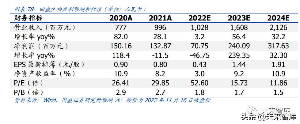 兽用化药龙头,化药产品品类丰富,充分受益于饲料端禁抗,中期猪价支撑需求放量 增长。回盛生物成立于 2002 年,主要从事兽用药品、饲料及添加剂的研发、生产和销 售。截至 2022 年 6 月末,已取得兽药批准文号 142 个。销售规模稳居国内兽用化药制 剂领域企业年销售额前 10 名。2020、2021H1 充分受益于饲料端禁抗,收入规模分别 同比大幅增长 81.98%、86.78%,显著提速。2021/2022Q1~Q3 分别实现营收 9.96/6.71 亿元,同比分别+28.14%/-9.98%,实现归母净利润 1.33 亿元/2640.60 万元, 同比分别-11.52%/-77.95%,其中2022Q3单季度实现营收2.74亿元,同比+30.59%, 实现归母净利润 1989.33 万元,同比+8.11%。盈利水平稳步修复,有望重回高成长轨道。①成本压制因素逐渐解除:2021 年下半年 兽药原料药行业受拉闸限电环保限产等因素影响出现供给收缩价格大幅上涨,彼时公司 原料药以外采为主,高价原料药使得成本端大幅承压。原料药行业价格在 2022Q1 起逐 步回落至正常水平,而公司采购周期以及存货周转周期因素导致盈利水平修复略滞后于 行业价格变化;②产能利用率稳步提升:公司 IPO 制剂与泰乐菌素原料药产能于年内投 产,但产能利用率仍处于较低水平,随产能规模扩张,规模效应有望持续体现;③产品 结构有望优化:下游养殖盈利水平提升,泰万菌素等高端产品销售仍在恢复过程中,同 时从中长期角度泰万菌素等新兽药仍处于成长期。综上,2022Q3 起公司毛利率、净利 率环比已逐步修复,预计未来仍有望持续改善。