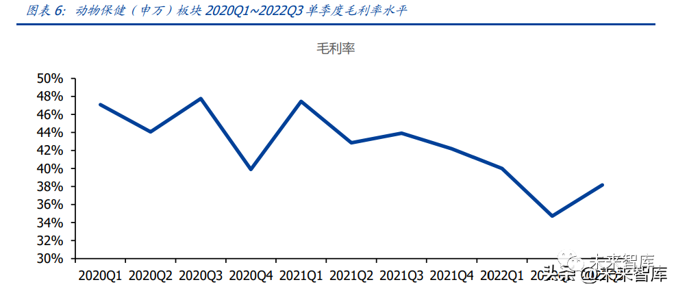 销售回暖趋势显著,利润仍处于稳步爬升阶段。2022Q3 单季度动物保健(申万)板块 实现营收 44.69 亿元,同比增长 14.44%,环比增长 15.31%,6 月生猪价格维持相对高 景气,下游养殖端从深度亏损状态逐渐进入正向盈利,动保产品需求改善,销售收入呈 现显著回暖趋势,而 2022Q3 板块单三季度归母净利润仍处于小幅同比下滑趋势。