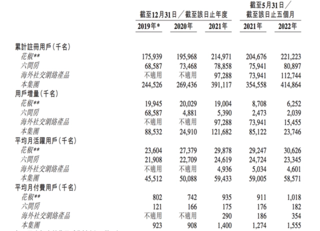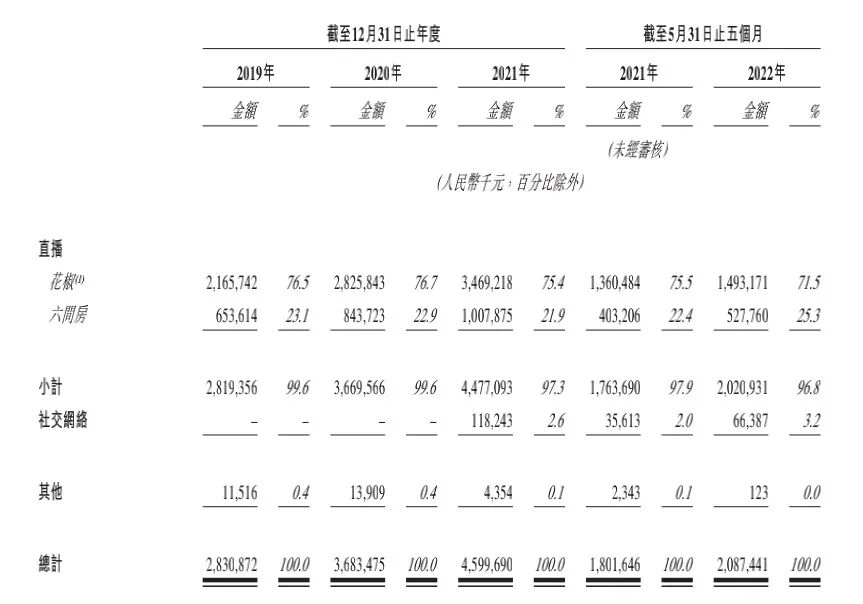 据招股书显示,2019年、2020年、2021年及截至2022年5月31日止五个月,花房集团的营收分别为28.31亿元、36.83亿元、46.00亿元、20.87亿元。其中,音视频直播收入在总营收占比分别为99.6%,99.6%,97.3%、96.8%。其中,近七成收入来自花椒平台。