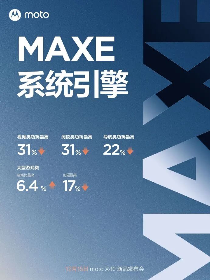 据官方介绍, Moto X40 采用了 165Hz 变奏高斯四曲面臻彩屏,号称“全曲屏沉浸式巅峰”。此外,联想中国区手机业务部总经理陈劲透露:“对于护眼屏,业内普遍说自家的产品蓝光低,但其实,有一个专门衡量屏幕蓝光占比的数据,是 HEV,之前各家屏幕普遍的 HEV 值都是 7%-9%。但在 moto X40 上,我们首创性的把 HEV 做到了低至 4.92%,远低于行业均值!结合 165Hz 高刷带来的细腻观感和全局 DC 调光的无频闪体验,不累眼、不毁眼、不刺眼,moto X40 这块屏幕,可以说看起来舒适极了!”另据官方此前的预热,moto X40将搭载第二代骁龙8芯片,CPU性能提升35%,能效提升40%;GPU性能提升25%,能效提升45%。影像方面,moto X40配备山海原画智能影像系统,自动模式直出5000万像素。支持地平线锁定防抖,无论手机如何翻转,都能拍出水平画面。电量快充方面,moto X40支持125W疾速闪充,7分钟充电50%,内置4600mAh电池,重度使用场景续航提升32%,还支持反向充电。其他方面,moto X40配备LPDDR5X、UFS 4.0存储规格,提供12GB+512GB存储组合,支持IP68级防水防尘,搭载 MYUI 5.0系统。同时,摩托罗拉还带来了moto独立研发系统调度引擎——MAXE。基于MAXE,其视频类与阅读类功耗最高可降31%,导航类功耗最高可降22%。面对大型游戏,MAXE调度引擎能耗比最高提升6.4%,时延最高降低17%。此前一款型号为 XT2301-5的摩托罗拉 5G 新机已入网工信部,预计为moto X40。认证显示显示该机拥有161.3×73.9×8.5mm 的机身尺寸,重 196 克,内置 4950mAh / 4450mAh 电池,采用 6.67 英寸 1080×2400 OLED 屏幕,支持 10bit色深与屏下指纹识别,后置 50MP+50MP+12MP 三摄组合,支持 4 倍光学变焦。鉴于此前发布的上一代产品moto edge X30一经发布就刷新了骁龙8旗舰的最低价格,新机能否继续刷新骁龙 8 Gen2 旗舰手机的低价记录,成为“骁龙 8 Gen2 价格屠夫”,值得期待。