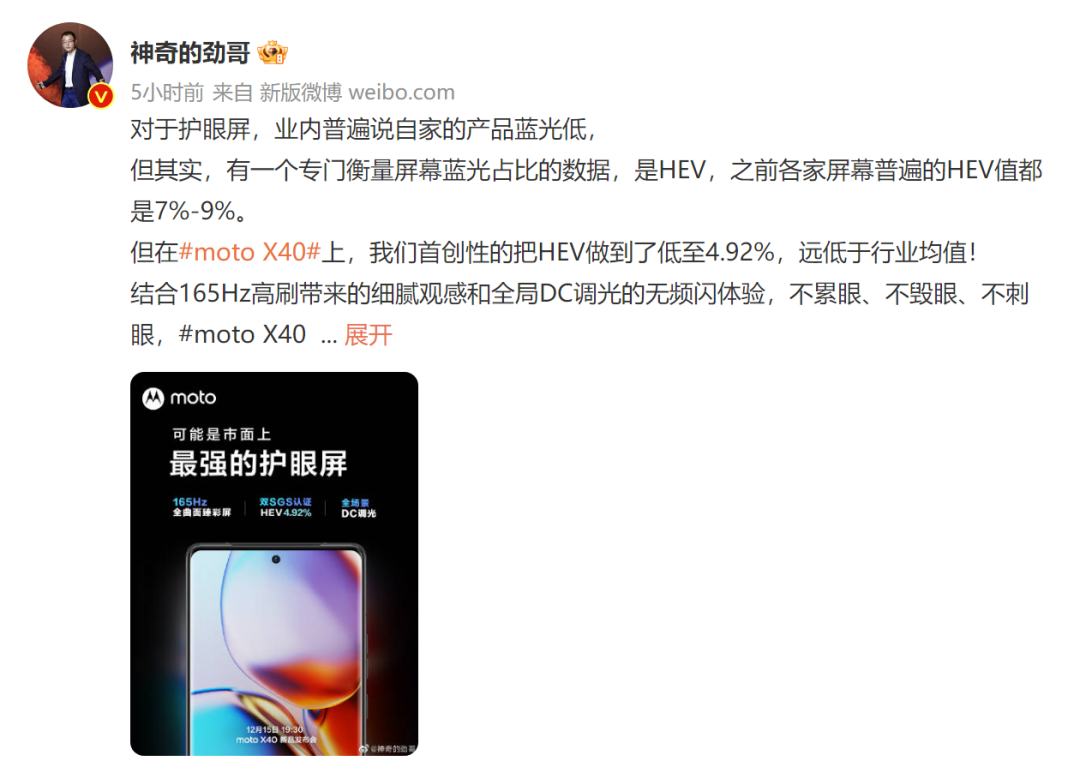 moto X40手机将于明天 19:30 正式发布,摩托罗拉手机官方今日对该机的屏幕进行了预热。