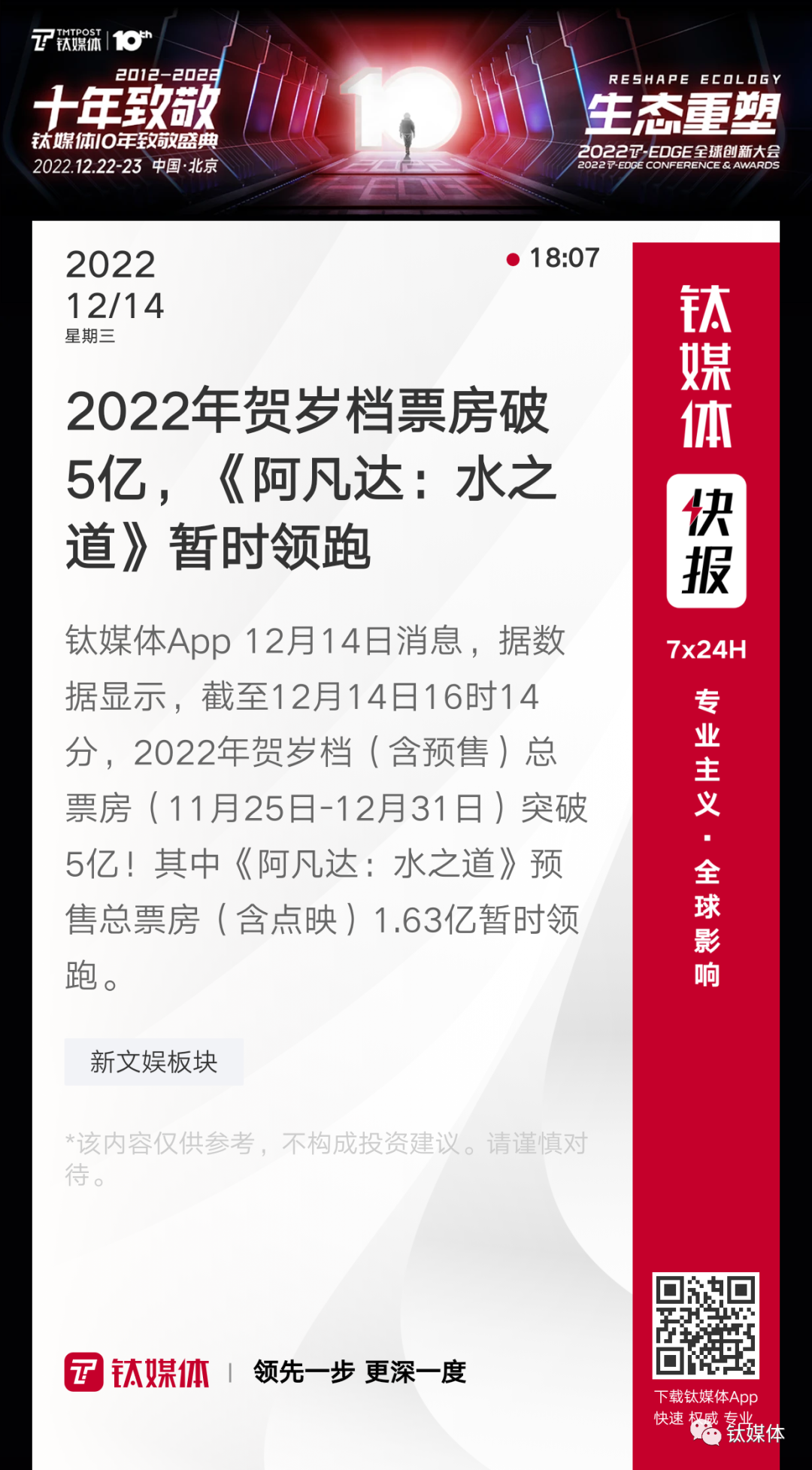 【2022年贺岁档票房破5亿,《阿凡达:水之道》暂时领跑】