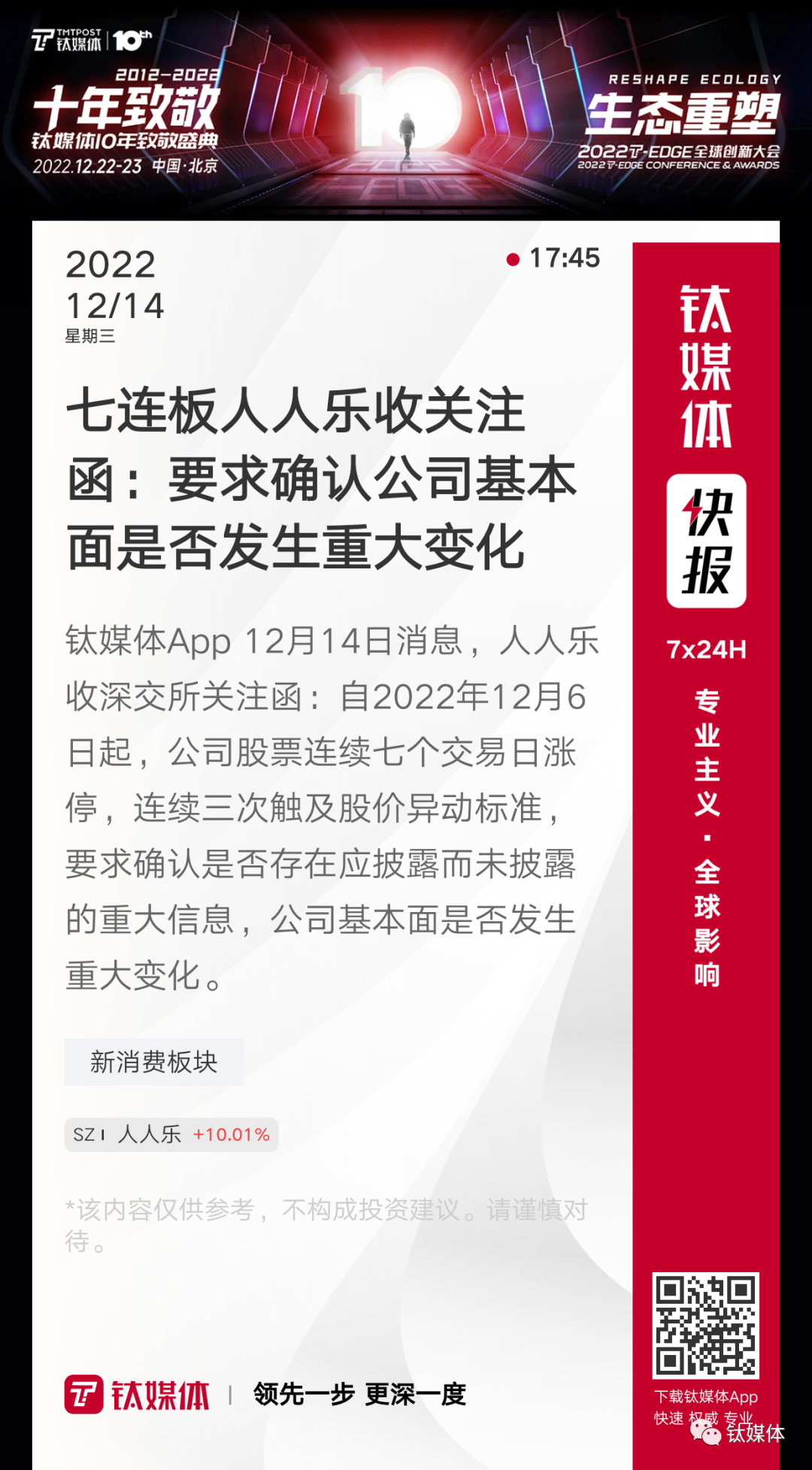 【七连板人人乐收关注函:要求确认公司基本面是否发生重大变化】