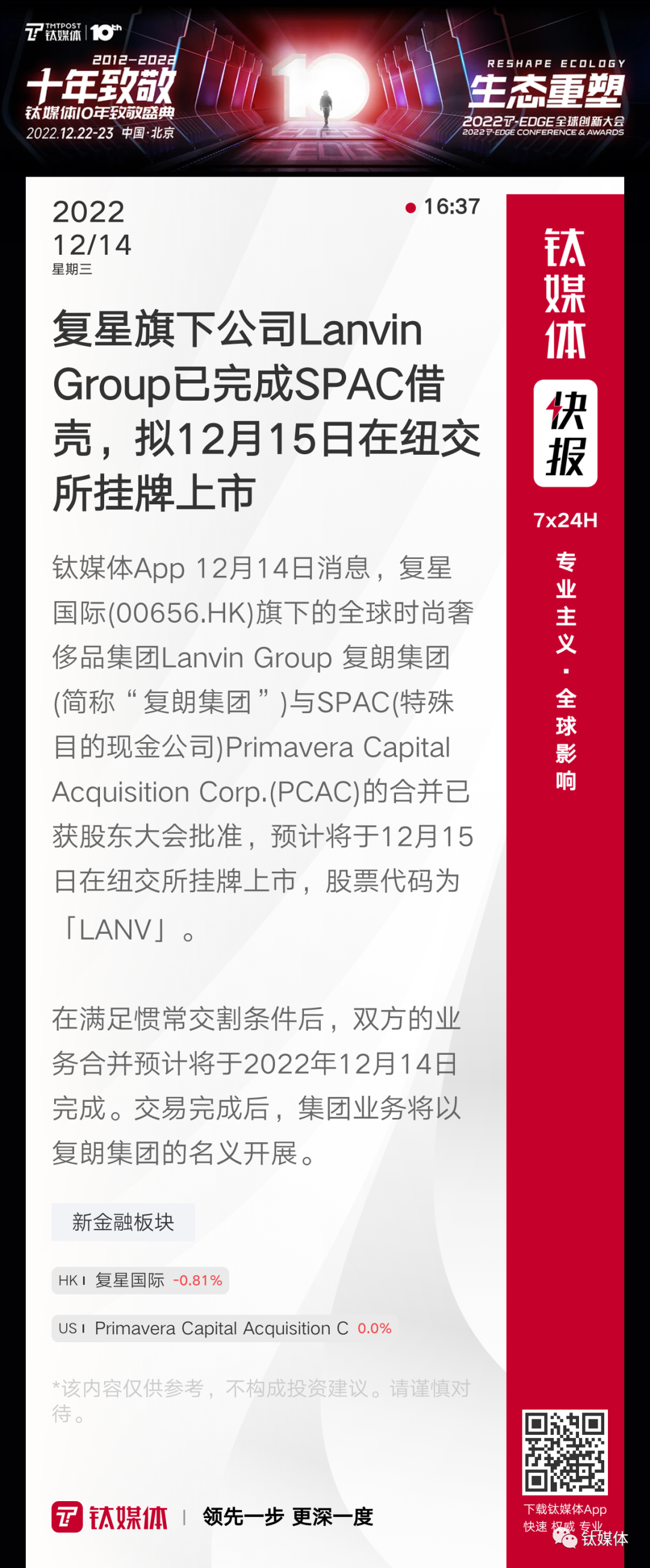 【复星旗下公司Lanvin Group已完成SPAC借壳,拟12月15日在纽交所挂牌上市】