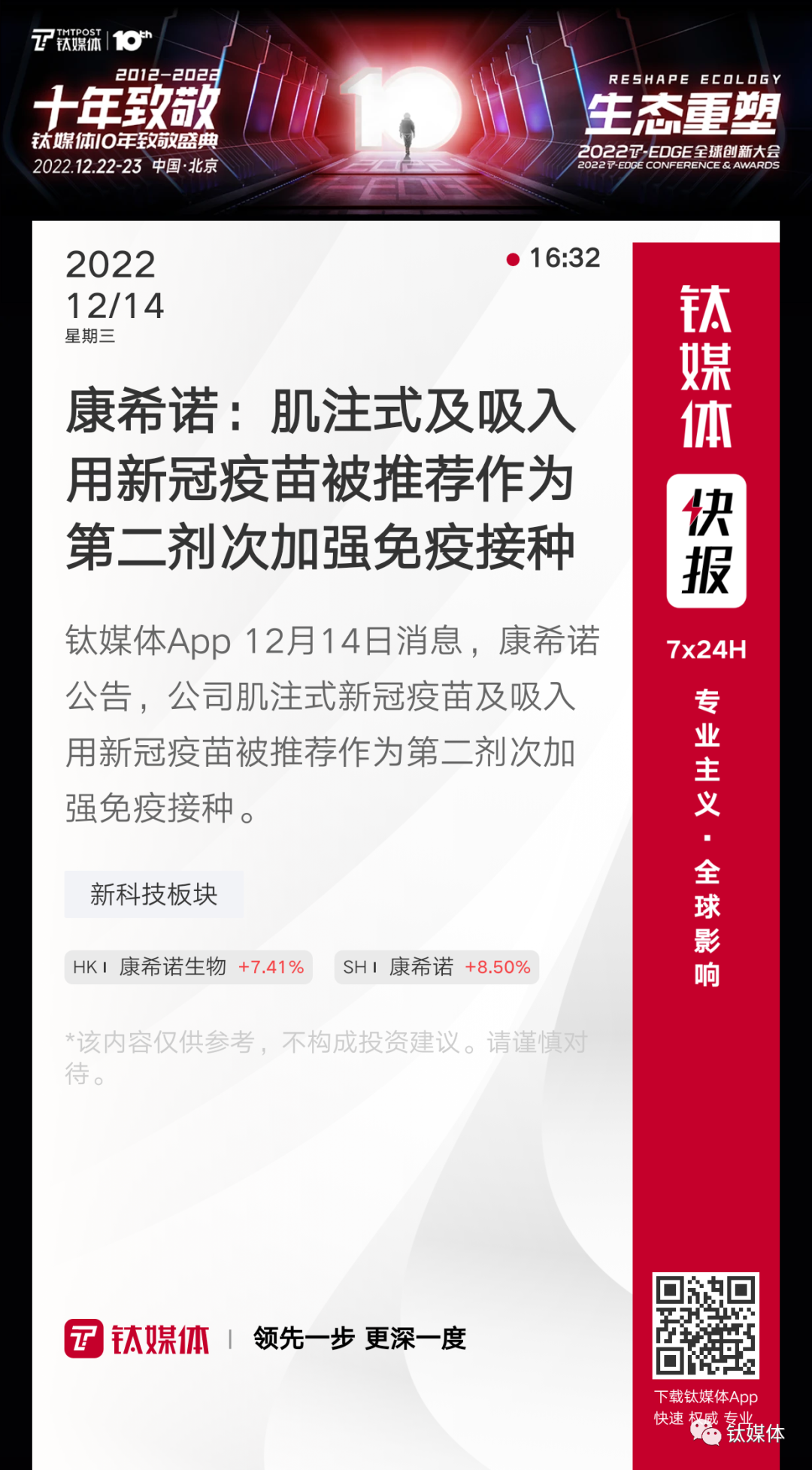 【康希诺:肌注式及吸入用新冠疫苗被推荐作为第二剂次加强免疫接种】