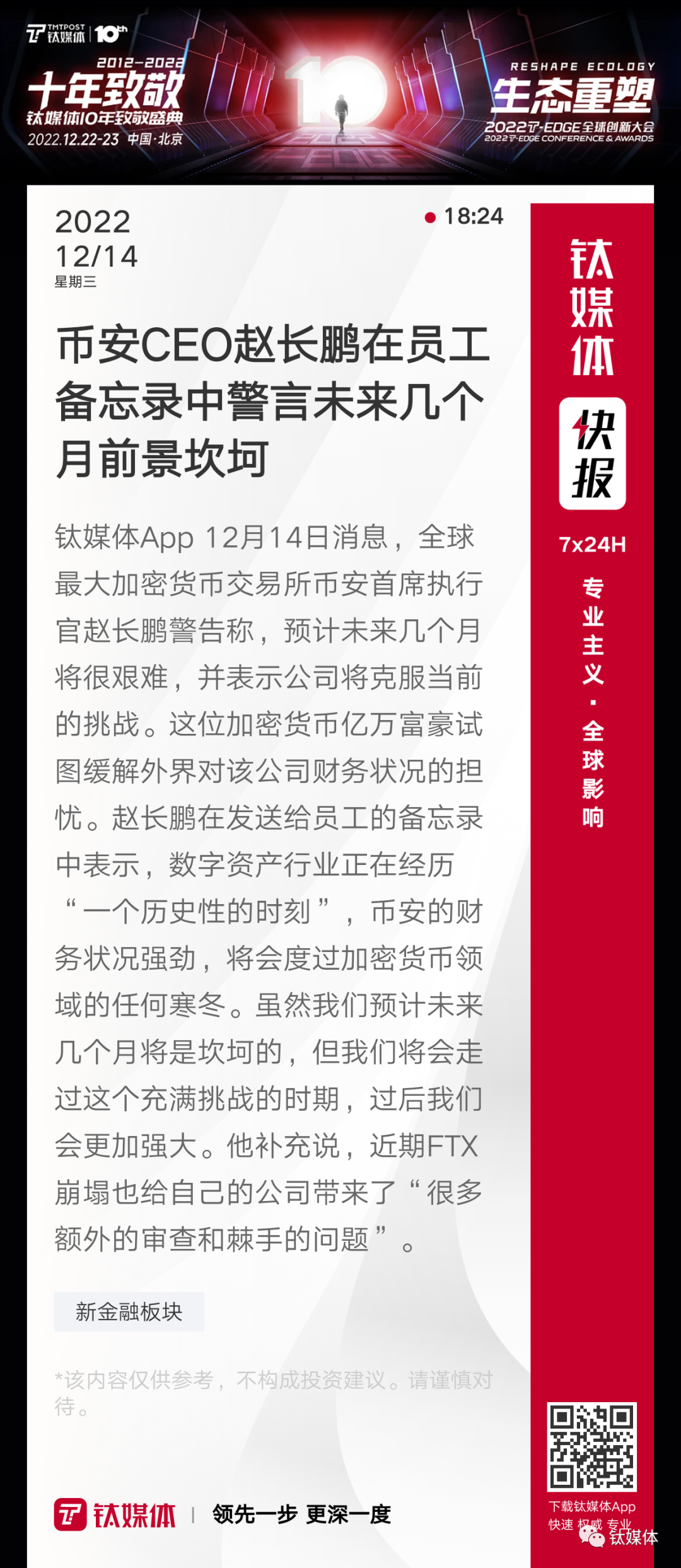 【币安CEO赵长鹏在员工备忘录中警言未来几个月前景坎坷】