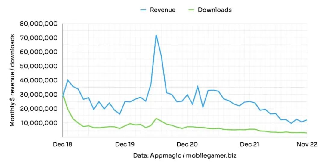 按照过去六个月数据,如今这款游戏的月均分成后流水1160万美元。在2022年8月份的时候,该游戏分成后月流水首次跌破1000万美元水平,而在上个月下载量只有280万次,是目前为止该游戏新增安装量最低的一个月。