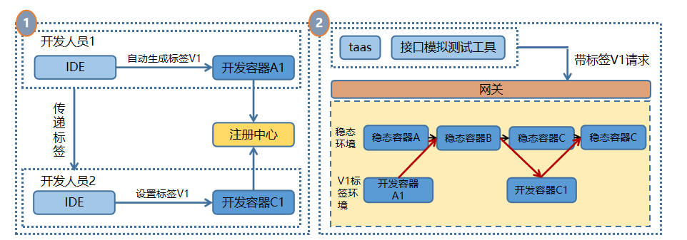 联调测试:开发联调测试过程,启动带有标签 V1 的开发容器,并通知联调方同样使用带有标签 V1 的服务来请求。完成基于开发容器 A(V1)、基准容器 B、开发容器 C(V1)的开发环境联调测试。