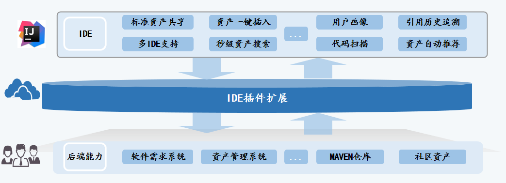以开发人员研发 IDE 为触点,通过可扩展插件方式提供研发辅助资产快速检索、不同 IDE 间和系统间资产共享、资产一键引入、代码规范扫描等一系列能力,为研发人员提供统一、便利的交互入口,形成合力对开发人员赋能。