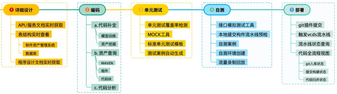 打通研发工具和流水线,自测完成自动提交构建流水线进行质量守护,从而为开发人员提供详细设计、编码、单元测试、自测、部署五个研发阶段的沉浸式开发体验,无需频繁切换不同支撑系统,打断研发流程,有效提升 DevOps 研发运维一体化能力水平。