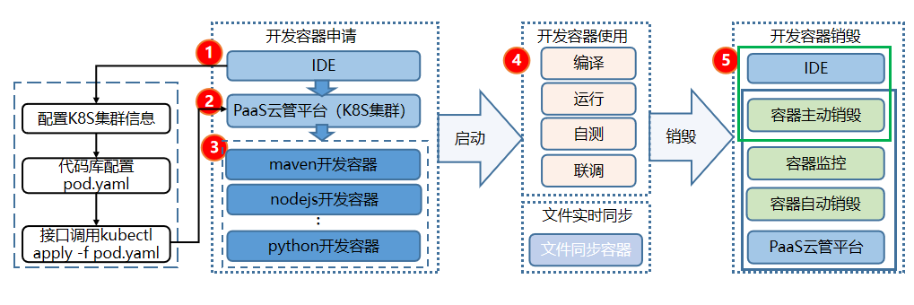 云管平台:基于 PaaS 云管平台,实现自测环境 Pod 的的集中管理,包括开发容器的创建、监控和销毁等功能。