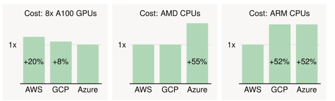 以 GPU 为例,截至 11 月份时,Azure 的英伟达 A100 GPU 实例价格最低,GCP 和 AWS 分别要比其高出 8% 和 20%。CPU 同样存在价格差异:对于最新的通用实例(配备同样的 vCPU 和内存),不同云服务商的定价差异可能超过 50%。因此,为某项任务选择最合适的云厂商和相应硬件,无疑能显著降低成本、提高性能。