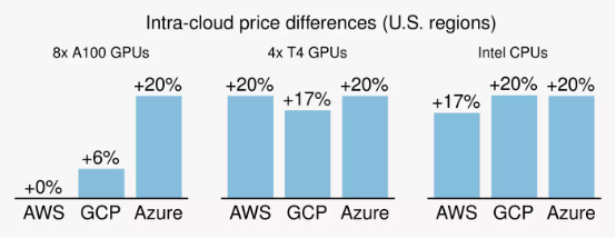 首先,不同区 / 区域间的价格差异也很大。对于普通的 GPU/CPU 资源,跨区按需实例的价差可能高达 20%。对于竞价实例,价差更是轻松达到 3 倍。简单来讲,用户可以在同一云服务商的多个区 / 区域间进行选择以降低设施成本。