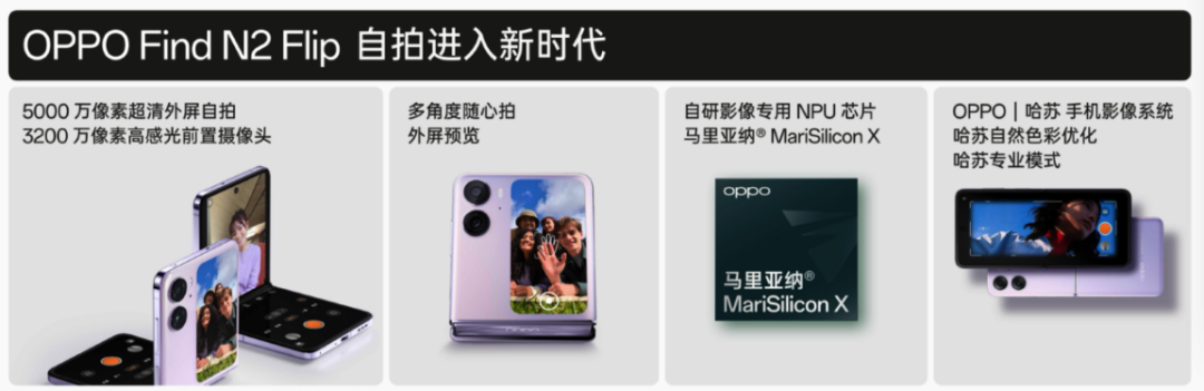自然3D曲线机身,转轴处采用微米级雕刻工艺、无缝闭合设计,提供流金、雅黑、慕紫三款配色。配备6.8英寸屏幕,平整度相比行业提升超50%,1600尼特峰值亮度,120Hz高刷。超轻固精工拟椎式铰链、航天级MIM超韧合金、超紧凑一体设计,通过德国莱茵折叠无忧认证2022。搭载天玑9000+移动平台,内置4300mAh电池,支持44W超级闪充,结合Color OS超算平台。前置3200万高感光传感器,后置5000万超高清摄像头,马里亚纳X、OPPO哈苏手机影像系统加持。Find N2 Flip配备3.26英寸竖向外屏,可实现几乎无裁切的拍照预览、一键回复、多场景服务卡片、一推即秀双屏同开以及GIF壁纸、宠物壁纸个性化自定义。
