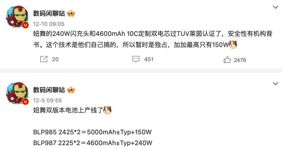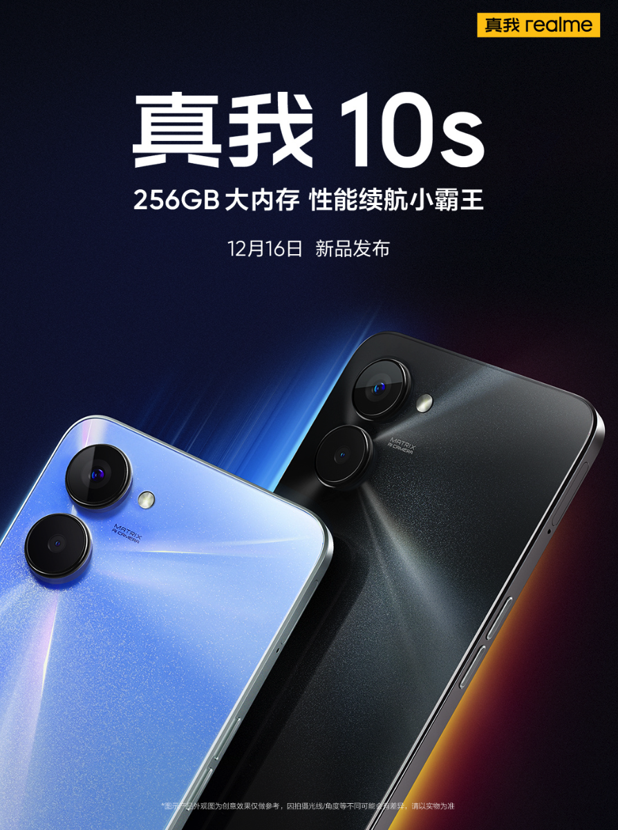 随后,这几款新品陆续开启了销售,并取得了不错的成绩。而随着时间的推进,现在也出现了更多realme真我新机的信息。今天,realme真我手机宣布,“真我10系列新成员登场!真我10s,性能续航小霸王。更多惊喜,12月16日见。”也就是说,真我10系列将再次推出新机,且这款新品将主打性能续航表现。同时,realme真我手机也公布了新机宣传海报。结合海报来看,这款真我10s的机身设计与真我10 Pro接近。其采用了平直的边框设计,机身侧边可见实体按键。后置镜头垂直排列、单颗安置在机身顶部一角。机身背壳上可见细碎的闪光,提供蓝色和黑色可选。目前还不清楚这款设备的机身采用了什么工艺,但参考来看,此前的真我10 Pro系列采用了细腻闪光砂工艺。目前还没有这款新机的具体参数信息出现,但也可以参考此前发布的真我10 Pro。其采用了6.72英寸LCD直屏,分辨率为2400*1080 FHD+,120Hz 高刷。核心搭载高通骁龙 695 5G 处理器,内置5000mAh电池,支持33W智慧闪充,搭载一亿像素超感光主摄、200万像素人像摄像头,还有一颗1600万像素自拍镜头,1599元起售。与此同时,网络上也有消息曝光了realme真我旗下其他系列新机的消息。结合博主@数码闲聊站 的爆料来看,realme GT Neo5 似乎有望在后续到来,其双版本电池上产线了。240W闪充头和4600mAh 10C定制双电芯过TUV莱茵认证了,且这个技术暂时是独占的。综合来看,多款realme旗下新机有望在后续到来,感兴趣的用户可以保持关注。