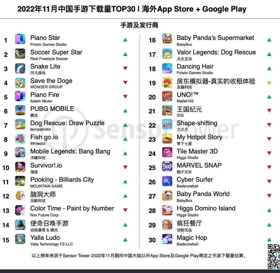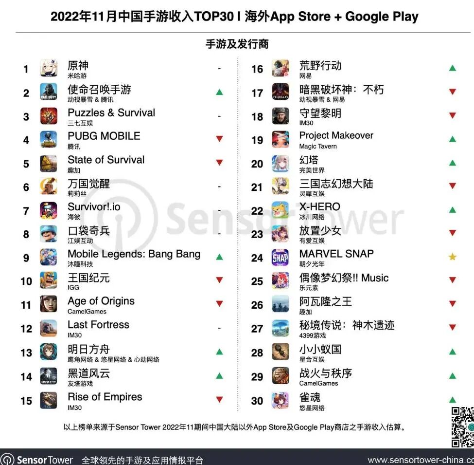 Sensor Tower商店情报平台最新数据显示,2022年11月中国手游产品在海外市场收入及下载量排行榜,详细榜单变化如下。