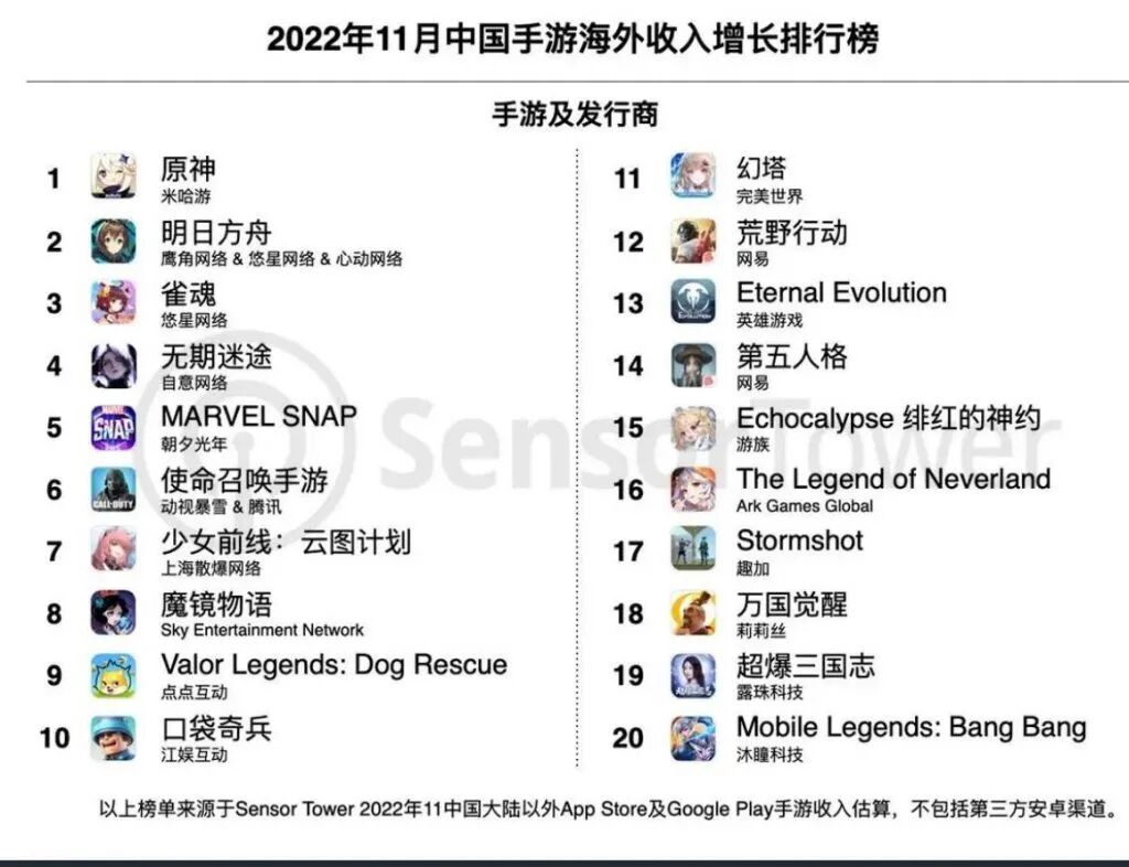 11月出海手游收入增长榜
