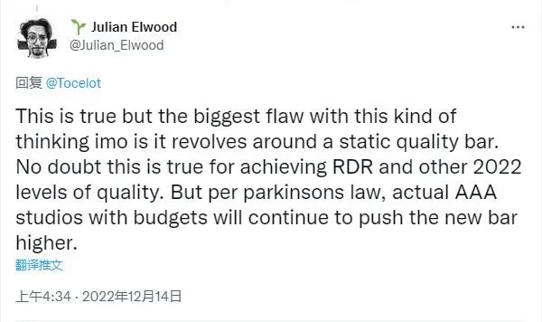 除此之外,来自顽皮狗的环境美术Julian Elwood还指出,Jon Lai对“AI能够节省开发时间”或者“帮助独立团队赶上3A公司”这类观点的看法假定了3A游戏的规格静止不动的刻舟求剑,但事实上,3A游戏公司还在不断地推动画面标准进步。