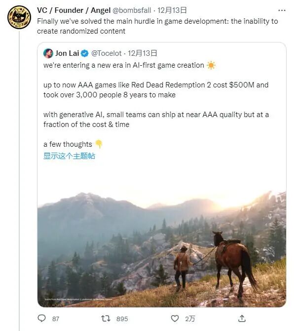 “如今,如《荒野大镖客2》这样的AAA游戏,需要3000人用8年时间加上5亿美元预算才能开发出来。但在AI技术的加持下,一个小团队就可以用很小一部分生产力推出与3A大作比肩的作品。”