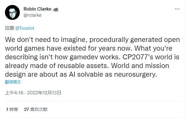 手游发行公司Supersonics的制作人Robin Clarke回应了Jon Lai所提及的用AI帮助《赛博朋克2077》提升生产力的畅想,他表示:“利用程序生成技术组装起来的开放世界游戏已经存在很多年了。你所说的这些东西都不符合游戏开发的实际。整个《赛博朋克2077》世界都使用的是可复用的素材,而像人物设计、世界搭建这种东西,想让AI来设计就像让AI做神经手术一样难。”