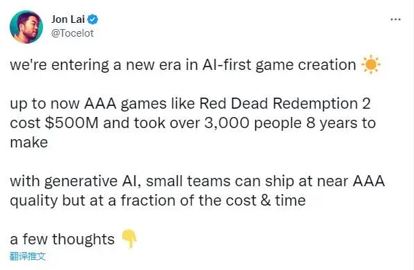 在加入a16z前,Jon Lai曾作为资深总监领队过腾讯的北美投资团队。他此前还曾成立过游戏工作室TwoDots,并将其出售给了Take-Two。总体来看,Jon Lai的职业背景主要集中在游戏投资领域。而在他作为投资家的眼中,AI技术在游戏开发领域拥有大展拳脚的潜力。Jon Lai在推特写道:“游戏开发正在进入’AI优先’的全新时代。”