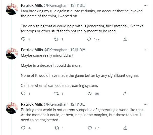 参与了《赛博朋克2077》、《巫师3》、《阿尔法协议》等多款3A大作开发的游戏设计师Patrick Mills的想法可以说对Scott Benson做出了注解:“AI真正能帮到我们的就是制作没什么重要性的填充物,比如那些根本没人会去仔细读的道具和文字贴图之类的。也许还能做一些无关紧要的2D立绘,也许在十年以后还能做的更多。但这些东西都不会让一个游戏的质量显著地提高。