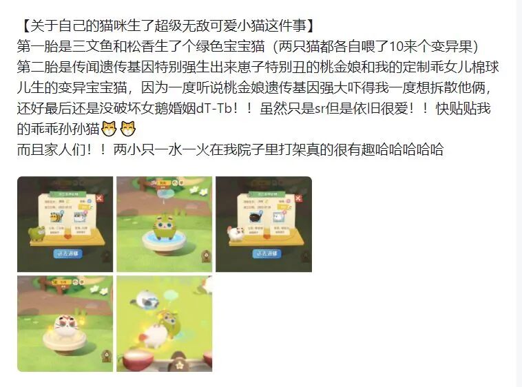 在Tap Tap上,就有不少玩家分享了自家的小猫崽。尽管玩家们调侃着因为父辈们强大的遗传基因而导致小猫咪有些“丑萌”,但吐槽背后的爱意仍然溢于言表。于他们而言,比起小猫崽的颜值,享受孕育和培养这些新生命的过程,才是《猫咪公寓2》带给他们的最纯粹的快乐。