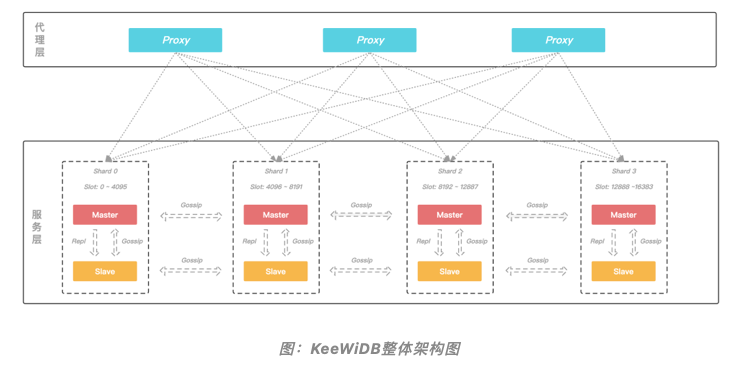据悉,KeeWiDB 整体架构由代理层和服务层两个部分构成,代理层负责与客户端进行交互,服务层负责数据的存储以及在机器发生故障时可以自动进行故障切换。