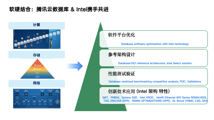 出色的数据库性能优化离不开计算、网络、存储以及监控运维等各方面技术优化,腾讯云数据库依托英特尔在硬件平台、架构层、应用层提供全栈优化的技术支持:除了前文提到的持久内存,在计算层面,英特尔至强处理器内置的密码操作加速,可以把数据库上的加密负载卸载到专用芯片上,从而降低 CPU 的负载,提高整体吞吐量。同时,在软件平台优化、参考架构设计、性能测试验证和创新技术应用方面,英特尔和腾讯云数据库团队展开了全面的合作,构筑了坚实的技术创新基座。
