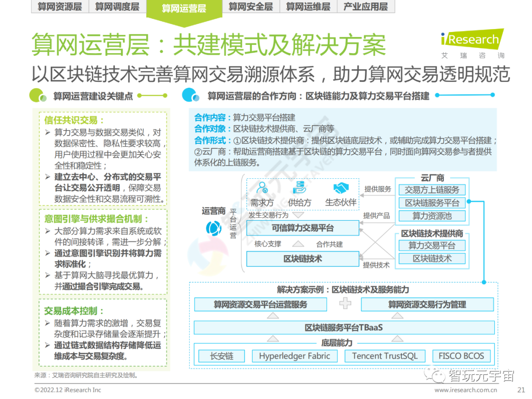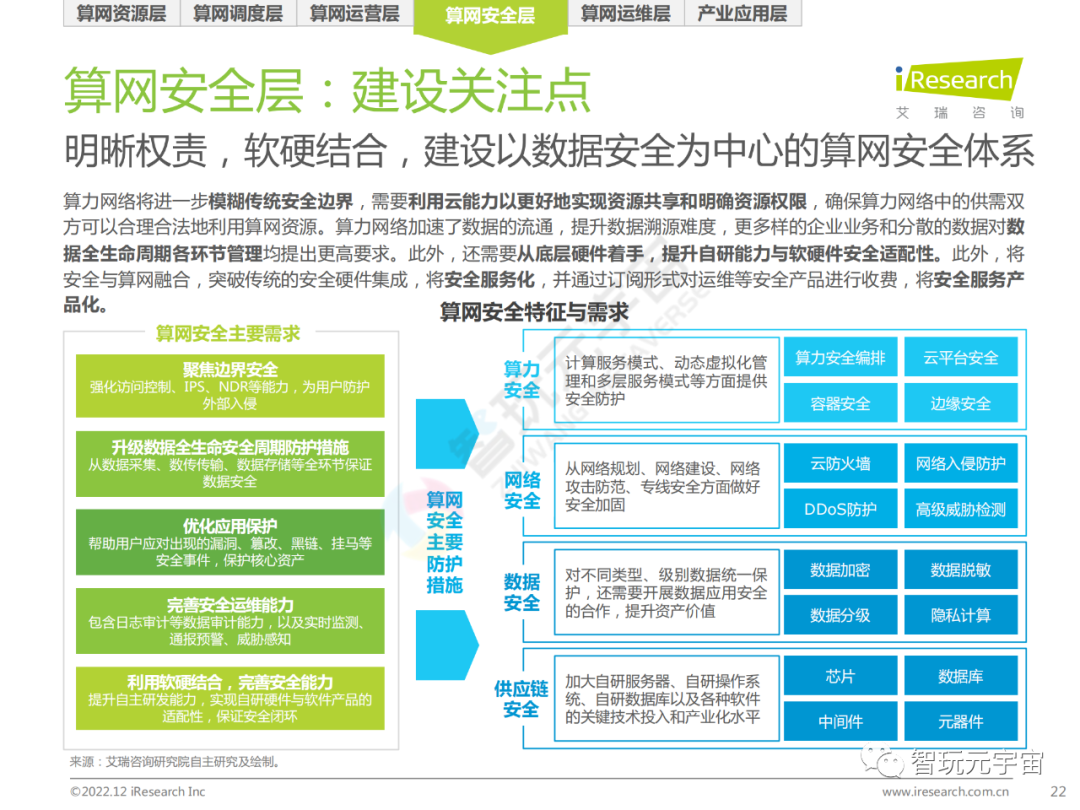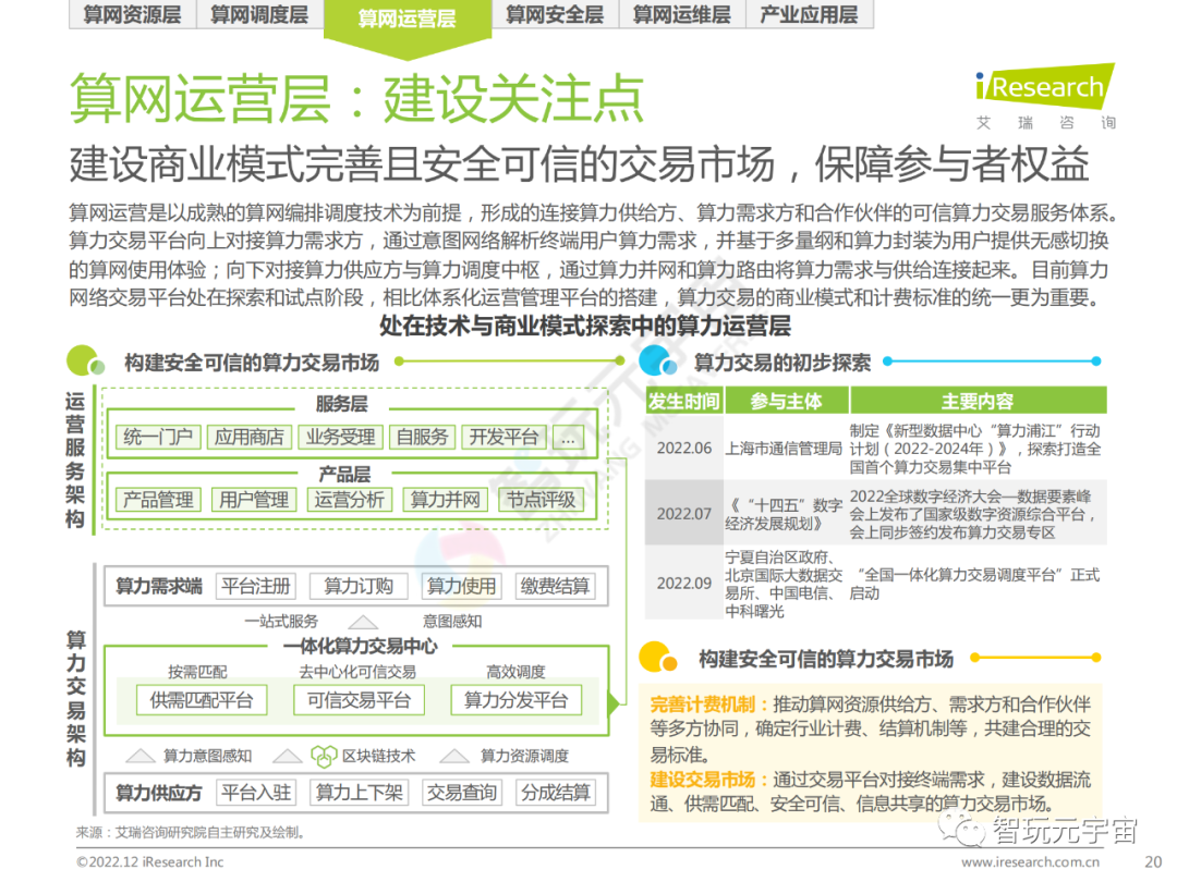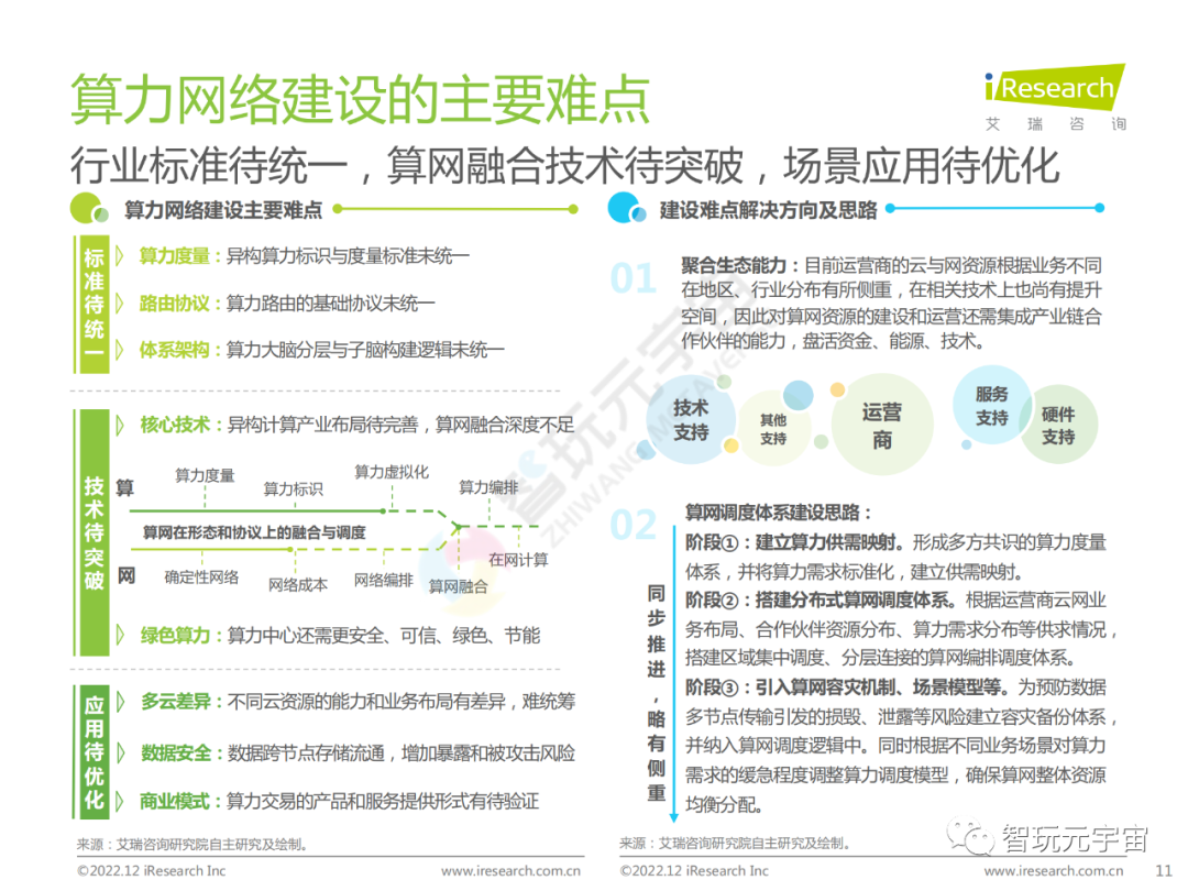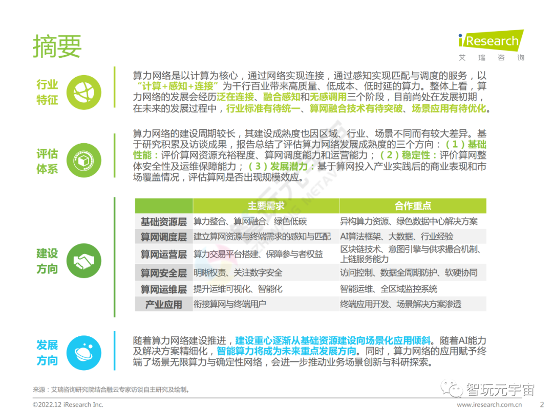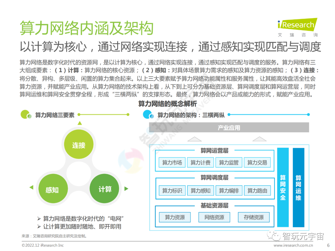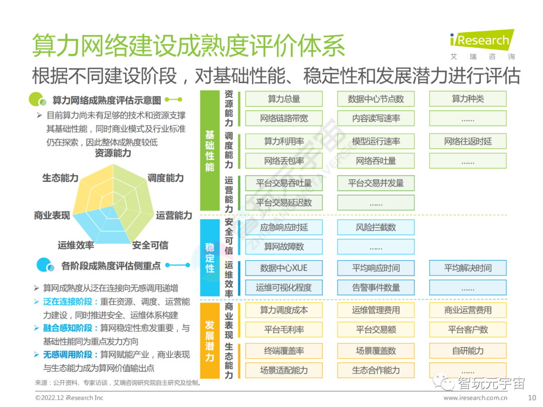 算力网络是以计算为核心,通过网络实现连接,通过感知实现匹配与调度的服务,以“计算+感知+连接”为千行百业带来高质量、低成本、低时延的算力。整体上看,算力网络的发展会经历泛在连接、融合感知和无感调用三个阶段,目前尚处在发展初期,在未来的发展过程中,行业标准有待统一、算网融合技术有待突破、场景应用有待优化。算力网络的建设周期较长,其建设成熟度也因区域、行业、场景不同而有较大差异。基于研究积累及访谈成果,报告总结了评估算力网络发展成熟度的三个方向:(1)基础性能:评价算网资源充裕程度、算网调度能力和运营能力;(2)稳定性:评价算网整体安全性及运维保障能力;(3)发展潜力:基于算网投入产业实践后的商业表现和市场覆盖情况,评估算网是否出现规模效应。![]()