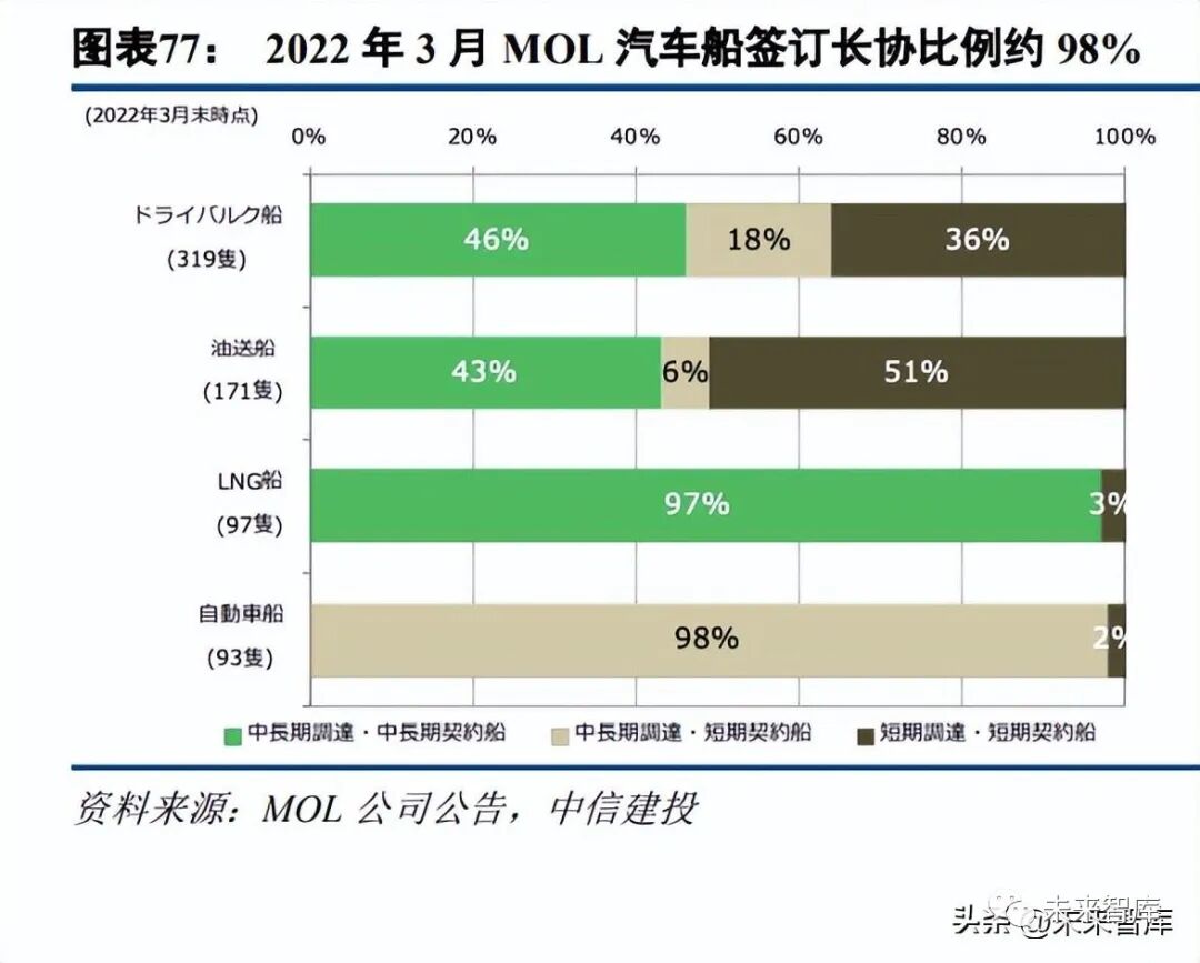 日韩汽车船企股东均为汽车厂商或其财团,大部分运力均与其所本国的主机厂所绑定,从而造成现货市场 运力极度稀缺。根据彭博数据,三井住友信托控股株式会为三家日本汽车船企的控股公司,其属于三井集团和 住友集团旗下,丰田汽车则隶属于三井集团;同时三菱日联金融集团(MUFG)也均有持股,本田汽车、三菱 汽车均属于三菱集团旗下。Hyundai Glovis 则隶属于现代起亚汽车集团。根据 MOL 公告数据,2022 年 3 月 MOL 汽车船签订长协比例约 98%,现货市场运力较为短缺。