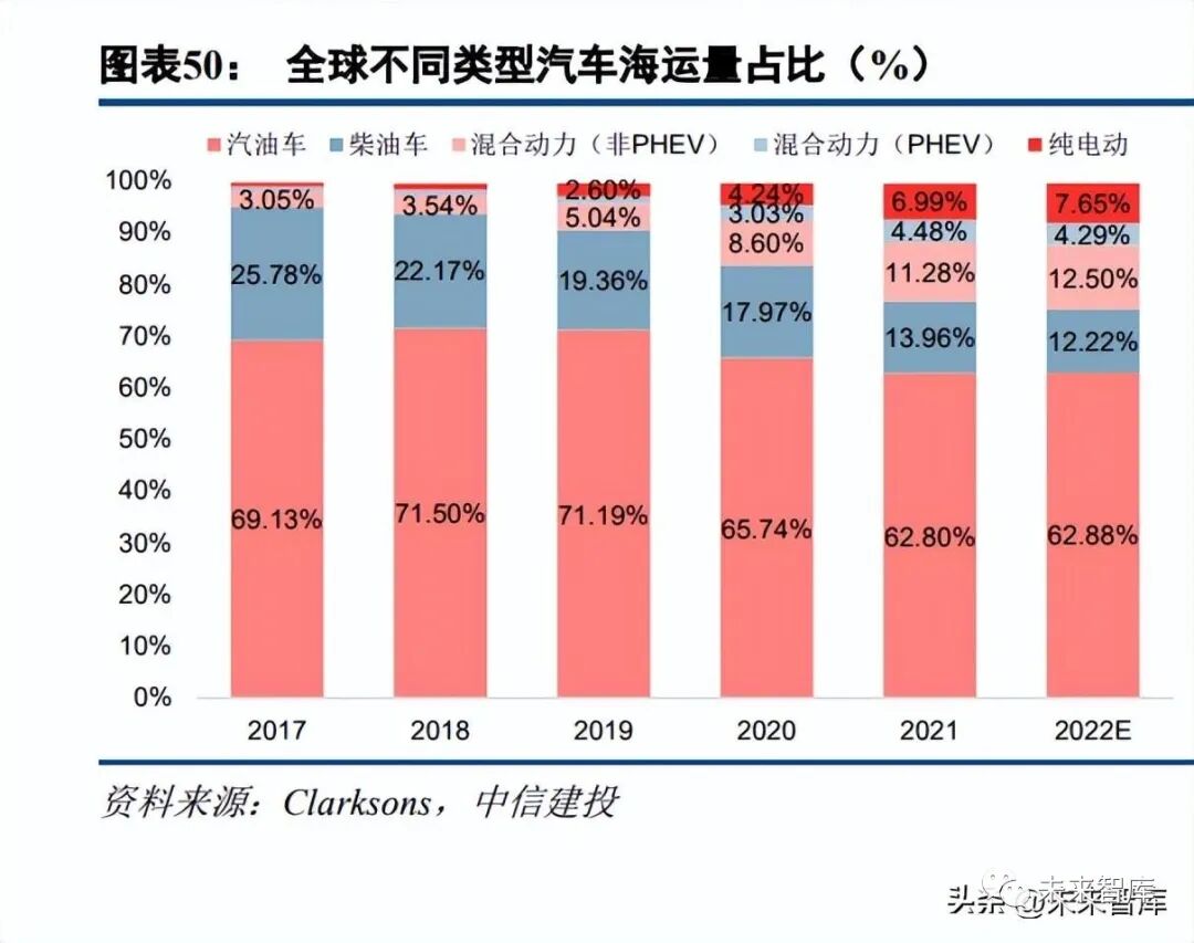 全球新能源汽车海运量占比由 2019 年的 9%显著提升至 2021 年的 20%。根据 Clarksons 数据,2021 年纯 电动汽车和混合动力汽车海运量约 537 万辆,占全球整体汽车海运量的 22.8%,远高于疫情前 2019 年的 9.0%, 预计 2022 年将进一步提升至 24.4%。电动汽车通常比普通燃油汽车更重,相应增加了海运吨位运输需求。根据 Automotive Logistics 2019 年数据, 标准内燃机(ICE)汽车的平均整备重量(汽车完全装备好的空车重量)约 1,400KG,电动汽车的平均整备重量 约 1,600KG,主要归因于电池重量通常在 300-500KG 之间,大大增加电动汽车的整备质量。随着消费者对于 SUV 等更大尺寸的车辆、续航里程更长的偏好,推动电动汽车的平均重量或持续上升。叠加纯电动汽车和混合动力 汽车在全球汽车市场份额的增加,将需要更多汽车船运力以满足其装载空间的需求。