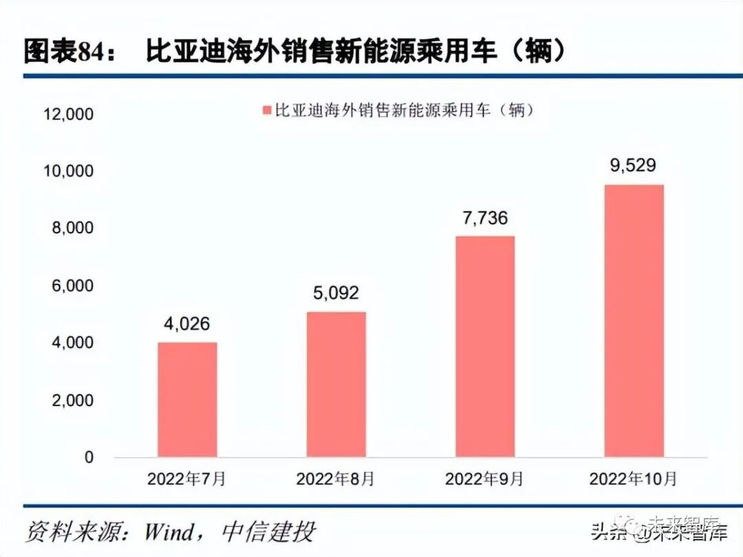 目前比亚迪海外乘用车布局已经遍布欧洲、拉美、中东、东亚和东南亚等市场,2022 年 7 月比亚迪出口量 开始显著发力。2022 年 7 月比亚迪进入日本市场,8 月进入泰国市场,9 月底官宣进入欧洲市场,10 月进入印 度、巴西乘用车市场,已与多国企业签署合作协议,海外市场布局逐步完善。2022 年 7 月比亚迪新能源汽车出 口开始发力,10 月单月新能源乘用车海外销量已达 9529 辆,而 2021 年 5 月-2022 年 6 月比亚迪累计出口量为 9926 辆,已经接近之前一年的出口量。截至 2022 年 10 月比亚迪产销量分别为 22.0 和 21.8 万辆,推算年化产销量约 264 万辆。2022 年 9 月,比 亚迪集团董事长兼总裁王传福在财报电话会上表示:比亚迪准备冲击 400 万辆销量。当前比亚迪海外销量仍处 于快速发展阶段,根据 10 月海外新能源乘用车销量推算,年化销量约 12 万辆。根据 2021 年全球汽车船运力和 实际运量推算,7,700 CEU 汽车船一年平均汽车运量为 4.56 万辆,若 8 艘 7,700 CEU 汽车船全部建造完成,合 计可完成年度运量或将达 36.48 万辆。若 2025 年比亚迪海外销量取得较大进步,或仍需向汽车船企寻求运力。