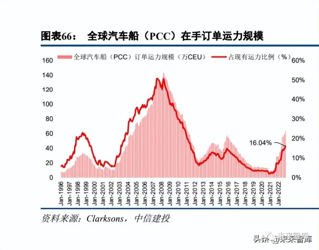 2021 年起全球汽车船订单显著增加,绝大部分为 LNG 双燃料动力,部分是氨、甲醇燃料就绪船舶以及电 池混合动力船舶。2020 年全球汽车船订单运力占现有船队比例一度下降至约 2%,2021 年起汽车船运价有所回 升,叠加 IMO 环保法规议程加快,NYK、K-Line、MOL、WalleniusWilhelmsen 等主要汽车船企订单活动显著 增加。截至 2022 年 11 月初,全球汽车船在手订单共有 86 艘船舶,合计约 64.2 万 CEU,占现有运力比例 16.04%。其中 6-8,000 CEU 汽车船为主要订单船型,占比达 83.0%。同时,2021 年以来新增汽车船订单绝大部分具备使 用 LNG 燃料的能力,部分汽车船订单为氨、甲醇燃料就绪船舶以及电池混合动力船舶。当前在手订单运力预计将于 2024 年集中交付,2024 年交付运力占现有订单运力约 51.3%。根据现有手持 订单运力推演,预计 2023 年-2025 年交付运力规模分别为 7.6 万、30.8 万、16.6 万 CEU,分别占在手订单运力 的 12.7%、51.3%和 27.7%。2021 年汽车船市场好转后拆解量迅速下降,汽车船老龄化严重,20 岁以上船舶运力规模占比约 15.1%,仍 面临较大的拆解压力。根据 Clarksons 数据,2020 年共有 23 艘汽车船(约 11.4 万 CEU)被拆除,是 2016 年以 来拆解量最高的一年,其中日本主要汽车船运营商进行了大量拆解活动。2021 年汽车船市场迅速反弹后,拆解 活动迅速停止,2022 年至今仅拆解了 1 艘 904 CEU 汽车船。而船龄在 20 岁以上的汽车船运力规模约 60.4 万 CEU, 占比达 15.1%。叠加 2023 年 IMO 新环保法规的趋严,老龄船仍面临较大的拆解压力。
