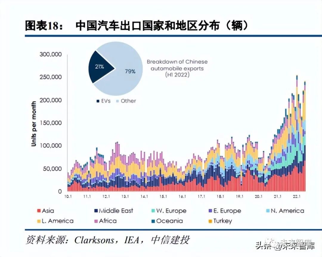 分地区看,中国汽车出口至欧洲市场取得较大突破,欧美经济发达地区增量明显。从中国汽车出口地区占 比来看,2020 年下半年以来中国汽车至欧洲出口量显著提升,2021 年出口至欧洲汽车量占比由 2019 年的 10.0% 提升至 22.7%;中国出口至亚洲汽车量占比有所回落,由 2019 年的 43.1%降低至 36.4%。从中国汽车出口地区 增速来看,增量主要在经济发达地区,2021 年和 2022 年 1-8 月中国至欧洲出口量增速分别为 204%和 41%,至 北美出口量增速分别为 101%和 106%,非洲表现相对较弱。具体国家方面,主要出口至智利、墨西哥、沙特、 比利时和澳大利亚等市场。