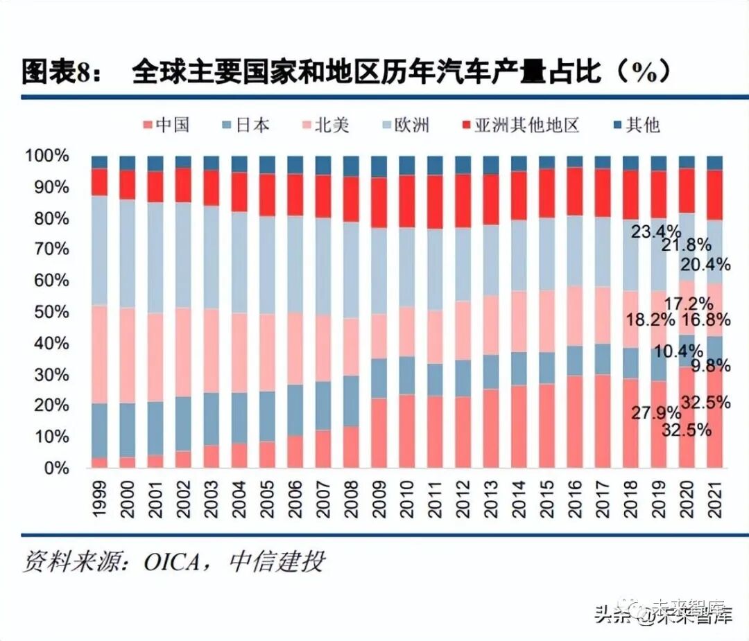 整体而言,欧美产销缺口显著扩大,亚洲作为全球汽车行业生产集中地,填补欧美地区汽车需求。需求端, 2021 年北美和欧洲的产销量缺口分别为 473.2 和 54.4 万辆,较 2020 年分别增长 66.1 和 77.4 万辆,产销缺口显 著扩大。供应端,2021 年亚洲整体产量占全球产量的 58.3%,中国近 20 年来汽车产业发展迅速,从 2001 年中 国汽车产量占全球的 4.1%,迅速增长至 2021 年占全球产量的 32.5%;而北美和欧洲产量占比持续下降,2021 年合计为 37.1%。欧洲内部方面,汽车生产主要集中于德国、西班牙、捷克、斯洛伐克等国家。