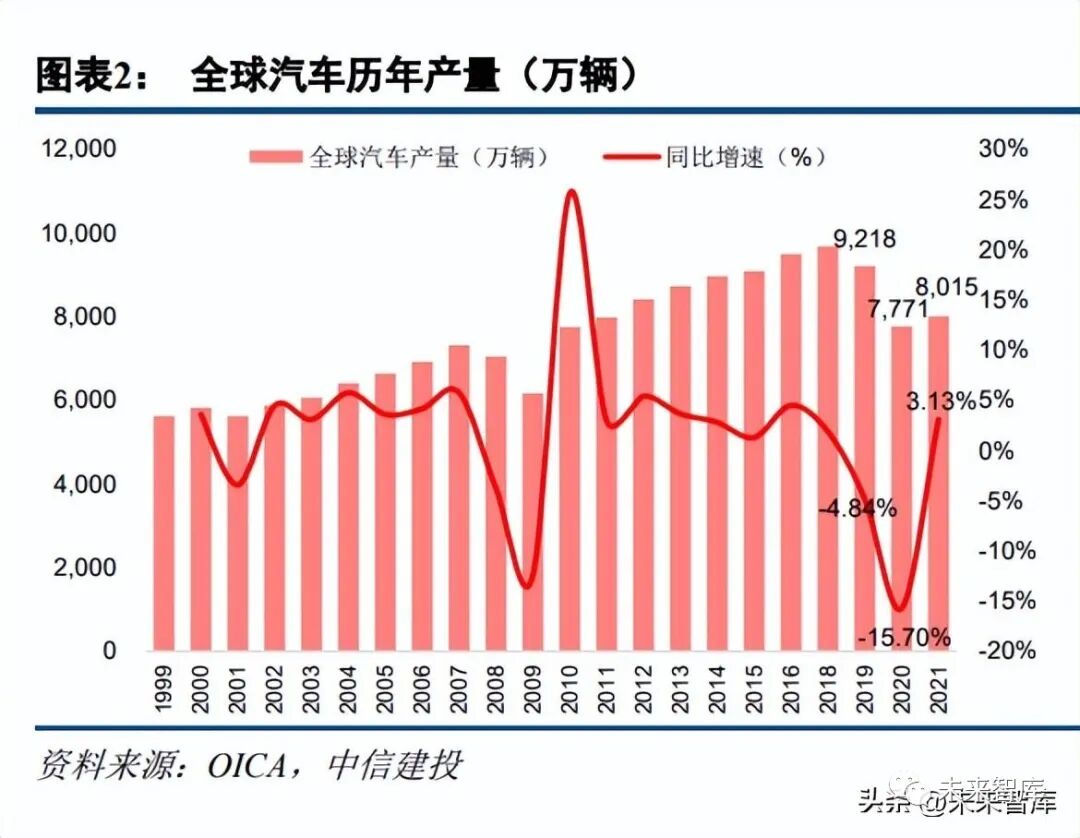 1)疫情影响:2022 年初奥密克戎变异毒株引发全球疫情反复,4 月汽车制造、供应链及销售环节再次受到 冲击,供应链中断影响持续。从全球汽车销量月度变化来看,2020 年二季度有所反弹后,2021 8 月起因汽车 芯片短缺严重,2021 年 8 月-12 月全球汽车销量同比下降 14.5%,平均月销量同比下降 110 万辆。进入 2022 年, 奥密克戎变异毒株引发全球多个地区疫情大规模反复,多国汽车业一度停工停产,2022 年 5 月起美国、德国、 西班牙、法国等汽车制造大国汽车工厂陆续恢复生产,2022 年 1-9 月全球汽车销量为 5,901 万辆,同比下降 2.98%。