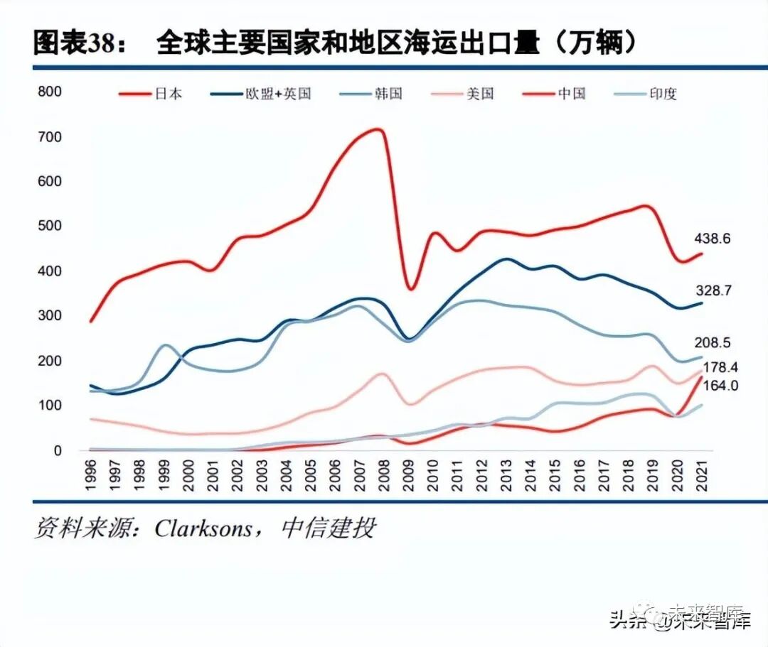 具体从汽车海运进出口国家来看,全球汽车主要海运出口国家和地区分别是日本、欧盟和英国、韩国、美 国和中国,其中 2021 年中国汽车海运出口崛起迅速,同比增速高达 103.6%;日本、欧盟和英国、韩国海运出 口份额有所回落。根据 Clarksons 数据,2021 年日本、欧盟和英国、韩国、美国和中国汽车海运出口量占比分 别为 18.6%,13.9%、8.8%、7.6%和 6.9%。其中 2021 年中国汽车海运出口量由 2020 年 80.6 万辆迅速增长至 164 万辆,同比增速高达 103.6%,份额从 3.8%迅速增长至 6.9%。与此同时,日本、欧盟和英国、韩国海运出口份 额由 2020 年的 20.3%、15.2%、9.6%降低至 18.6%、13.9%、8.8%。全球汽车主要海运进口国家和地区分别是美国、欧盟和英国、中国等,欧美国家海运进口量合计占比达 28.2%,2021 年澳大利亚、墨西哥、欧盟和英国海运进口量显著回升,均为中国汽车出口主要市场。根据 Clarksons 数据,2021 年美国、欧盟和英国、中国汽车海运进口量占比分别为 17.1%、11.1%、4.2%,各国家和地区海运 进口份额相对较为稳定。其中澳大利亚、墨西哥 2021 年海运进口量同比增速为 24.0%、15.5%,欧盟和英国同 比增速为 6.0%,均为中国汽车出口主要市场。