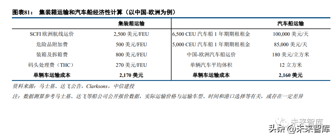 因此两种运输方法的选择取决于具体运输需求,包括预算、目的地、车辆数量、车辆类型和紧急情况等。如果需要尽快运输大批量的车辆,汽车船运输是相对更具成本效益的方法,集装箱运输效率远低于汽车船,但 是可以将其他物品和车辆一起运输至各大国际港口。集装箱运输单辆汽车价格测算:当前 SCFI 欧洲航线运价持续处于下跌态势中,截至 2022 年 11 月 11 日 SCFI 欧洲航线运价为 1,172 美元/TEU,我们假设中国-欧洲集装箱运价维持在 2,500 美元/FEU。根据马士基公告,燃 油车、电动汽车均属于危险品,需收取危险品附加费;达飞轮船公告显示,2021 年 6 月起亚洲-欧洲危险品附 加费为 300-500 美元/TEU,我们假设危险品附加费在 500 美元/FEU。同时,当前船公司为提升装箱效率,每个 集装箱平均仅装载 2 辆汽车,则对应集装箱单辆车运输成本为 2,170 美元。汽车船运输单辆汽车价格测算:截至 2022 年 10 月,5,000 CEU 和 6,500 CEU 汽车船 1 年期期租租金已分 别上涨至 85,000 美元/天和 100,000 美元/天。由于中国-欧洲返程货源较少,叠加当前燃油成本较高,汽车船公 司去程报价已达 180 美元/立方米,平均单辆汽车体积在 12 立方米左右,对应单辆车运输成本为 2,160 美元。因此,当前集装箱运输汽车市场价格与汽车船运输单车价格相近,若单个集装箱装载 3 至 4 辆车则集装箱 运输成本相对更低。