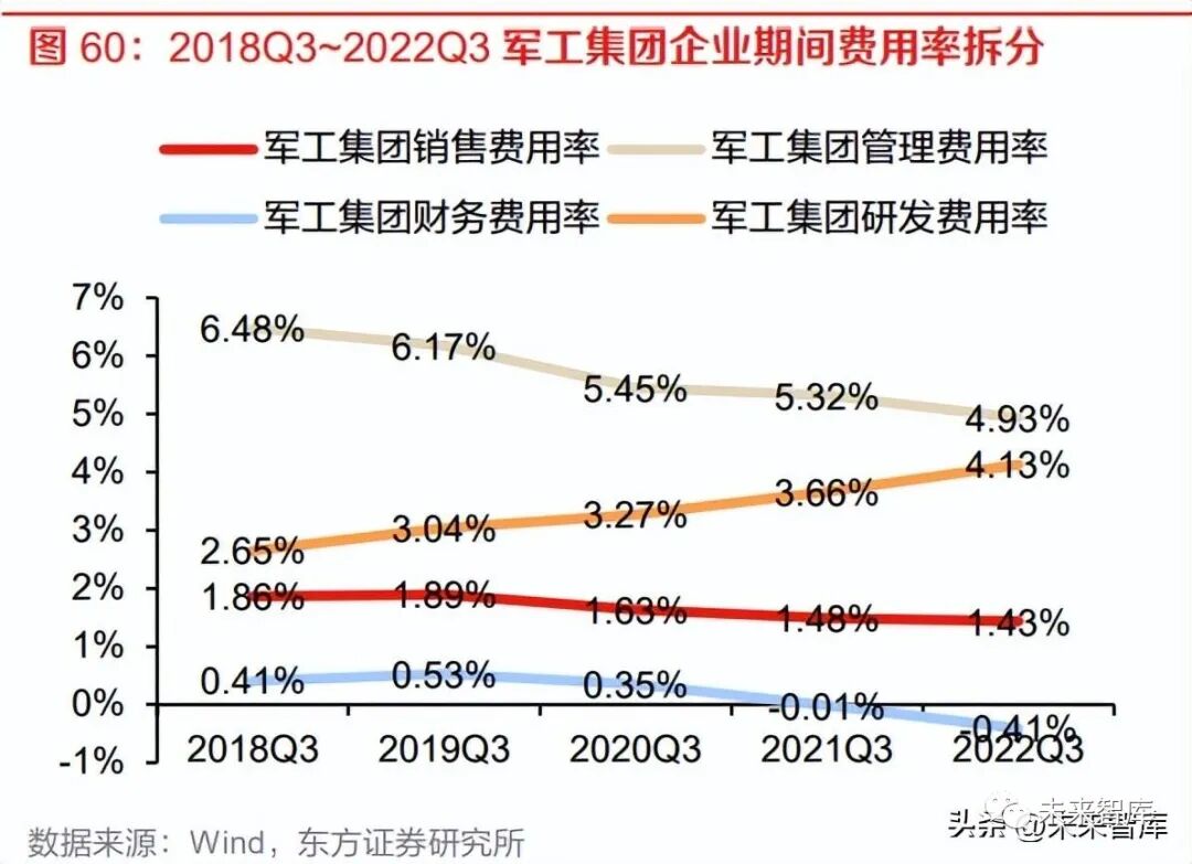 零部件:毛利率提升、期间费用率降低,22 年前三季度净利率有所提升。22 年前三季度零部件 层级军工企业综合毛利率为 42.63%,较 21 年前三季度提升 0.81pct,或是由于:1)上游层级企 业多数具备较为明显的规模效益,随着军品配套需求的增加,产能利用率提升带动毛利率提升;2)该层级企业逐渐由简单配套向高附加值核心领域拓展,相关配套公司近年来陆续上市且占比 提升。期间费用率同比降低 1.26pct,其中销售费用率降低 0.40pct,管理费用率降低 0.72pct,财 务费用率降低 0.89pct。综上,毛利率提升、期间费用率下降共同驱动 22 年前三季度零部件企业 净利率大幅提升。分系统:毛利率提升,费用结构持续改善,22 年前三季度净利率稳中有升。22 年前三季度分系 统层级军工企业综合毛利率为 30.04%,相比 21年前三季度提升 0.69pct。毛利率提升或是受益于 主机厂外包生产比例的持续提高,中游承接更多的业务以及更高价值量的配套,以及近年来相关 配套公司陆续上市且在分系统层级占比有所提升。期间费用率为 17.21%(+0.06pct),基本保持 平稳,有小幅上升,其中销售费用率(-0.04pct)、管理费用率(-0.26pct)和财务费用率(- 0.45pct)均有小幅改善改善,研发费用率有所提升(+0.81pct),费用结构持续改善。