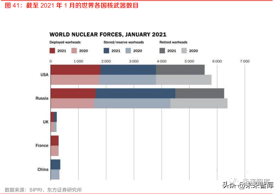 所谓“核三位一体”是指一个国家同时拥有洲际弹道 飞弹,潜射弹道飞弹和战略轰炸机三种核武器打击方式的能力。根据俄罗斯外交部和国际专家组作出的评估(基于 START 3 协议下提供的数据),俄罗斯的战略 核力量包括 517 辆战略运载工具,用于部署核武器、洲际弹道导弹、潜艇,和配备了 1420 枚核 弹头的重型轰炸机;而目前乌克兰不论是独立发展核武器,还是获得北约核武器部署的可能性都 非常低。中国奉行积极防御原则发展核力量。中国向来奉行独立自主的和平外交政策,是国际上“核裁军” 的重要推动者,并承诺中国核武器的使用只有在本国领土受到外界势力和威胁时才会作为反击之 用。在战略核力量的发展上,虽然中国拥有“核三位一体”,但对于核武器方面选择了相对平稳、 均衡的发展方式。根据斯德哥尔摩国际和平研究所(SIPRI)2021年的年鉴显示,截至2021年, 全球主要有核国家共拥有 13080 枚核弹,其中俄罗斯、美国和中国分列前三,相比俄罗斯 6255 枚、美国 5550 枚的核储备而言,中国的核储备数量仅从 2020 年的 320 枚增加到了 2021 年的350 枚。这可以说明中国从未想过使用核力量作为其实现战略目标的武器,而拥有核武器仅仅是 出于维护国家安全的需要。