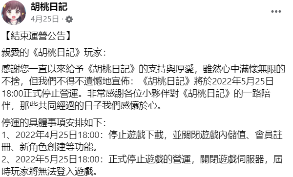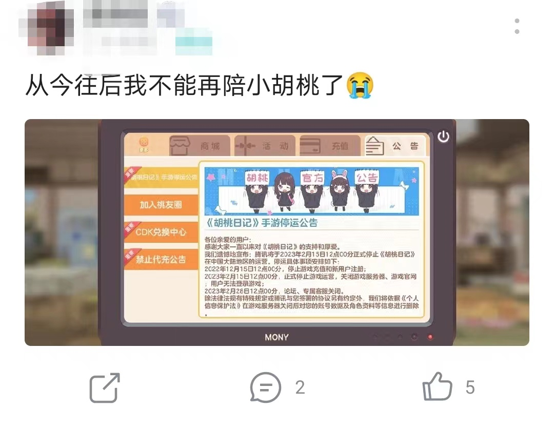 此前,今年4月25日,《胡桃日记》台服宣布2022年5月25日关服,而如今停运消息也来到了国服。茶馆为此感到遗憾,并感谢《胡桃日记》所带来的一路陪伴,让我们一起陪伴她走到最后吧。