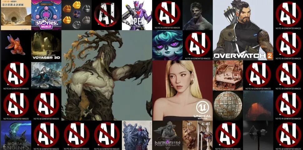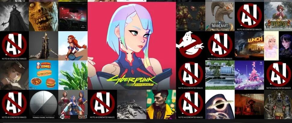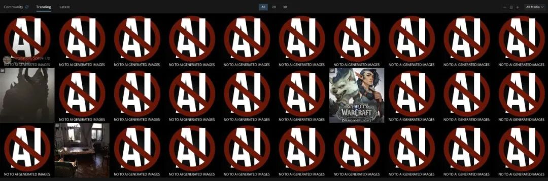 现在,这家网站的主页正在被同一幅带有红色禁止标志和“AI”字样的图片刷屏,图片下方还有一行小字,写着“对AI生成图像说不”。