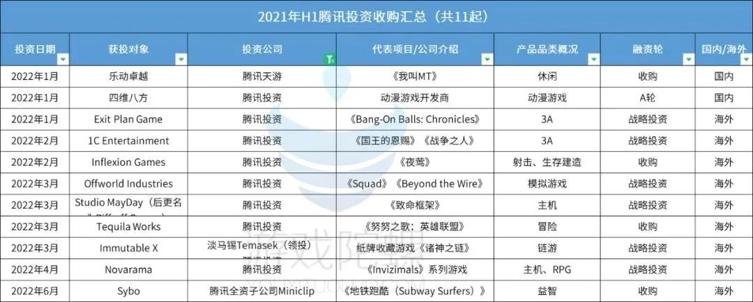 除了Shift Up,今年腾讯还拿下了不少海外游戏公司的股权。据游戏陀螺粗略统计,今年腾讯至少发起了16起游戏投资并购,其中有14起来自海外。近半年比较重要的投资并购事件包括: