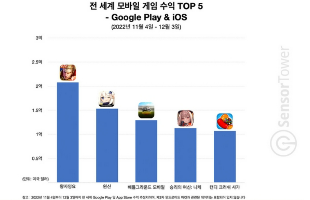 据SensorTower数据,《胜利女神:NIKEE》月收入超1亿美元,在11月收入榜榜单中仅次于《王者荣耀》《原神》以及《PUBGM》。同时,《胜利女神:NIKEE》也让腾讯拿下了11月全球游戏市场手游收入排行榜前五的三个位置。