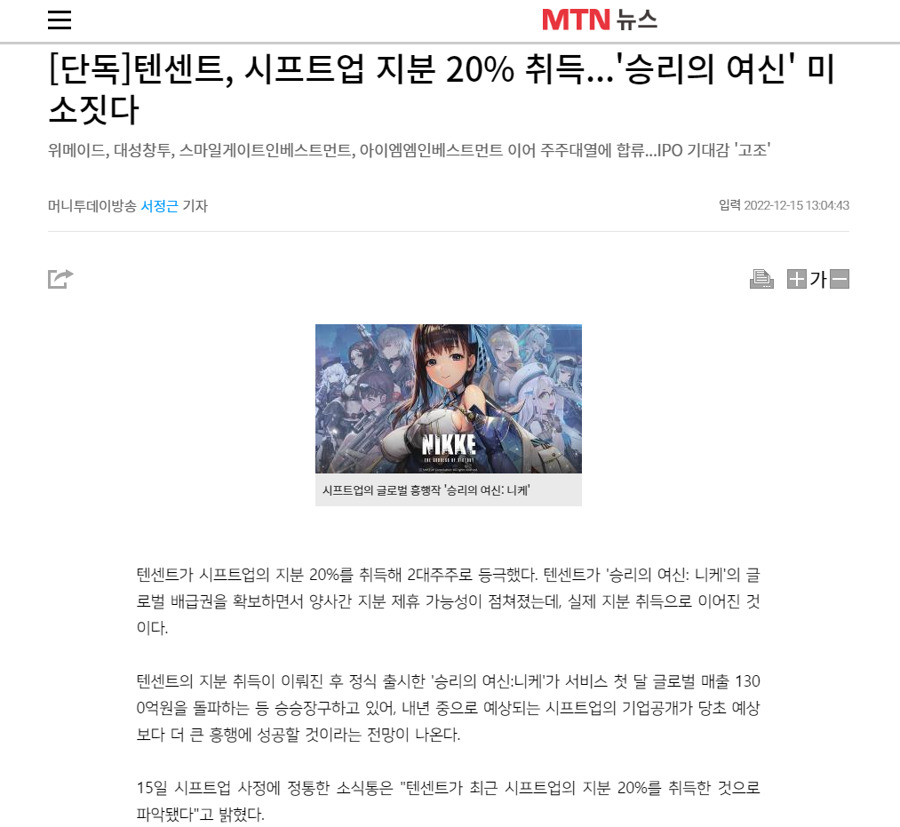 近日,据韩媒报道,腾讯投资《胜利女神:NIKKE》游戏研发商Shift Up,并获得了20%股权。投资完成,腾讯将成为仅次于Shift Up创始人金亨泰的第二大股东。目前,腾讯方面并未透露这起投资相关金额。