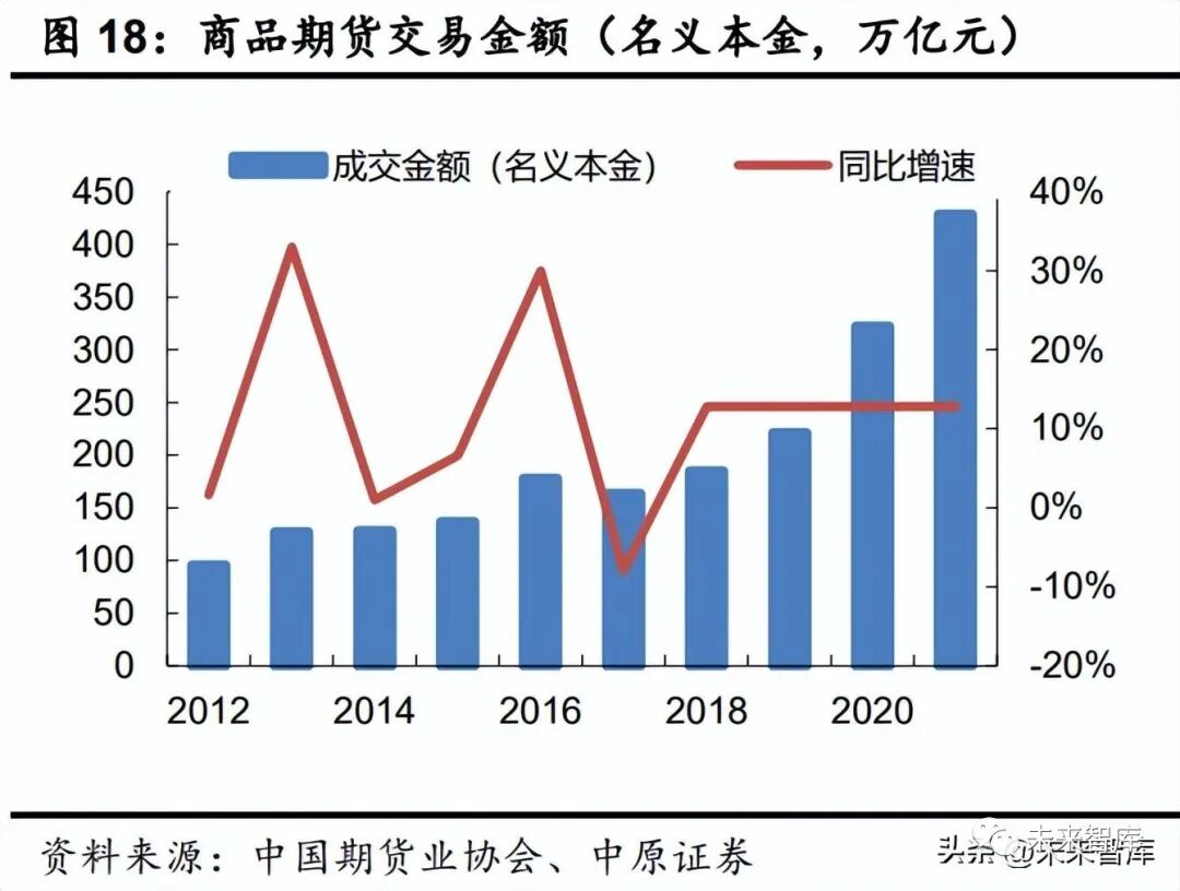 商品期货及其衍生品做市业务。商品期货属于小众市场,为解决我国期货市场长期存在的 合约不连续、近月不活跃的问题,2017 年开始我国期货市场开始探索引入做市商制度。截至目 前我国已上市交易的商品期货品种达 64 个,其中 55 个引入了做市商交易,券商以期货子公司、 期货子公司控股的大宗商品风险管理公司为主要载体参与到各商品期货合约的做市中。2021 年我国商品期货市场成交总金额(名义本金)为 428.15 万亿元,创历史新高,较 2014 年增逾 2 倍。